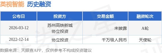 证券之星消息,根据天眼查APP于3月12日公布的信息整理,苏州英视智能科技有限公司A轮融资,融资额未披露,参与投资的机构包括苏州高铁新城,协立投资。