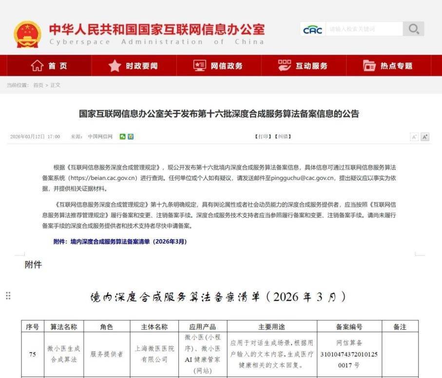 【大河财立方 见习记者 关帅康】3月12日,国家互联网信息办公室发布新一批境内深度合成服务算法备案信息,微医控股自主研发的“微小医生成合成算法”通过备案。
